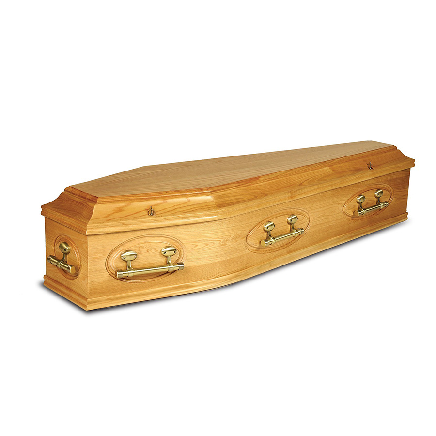 A magnificent red oak coffin in a high gloss finish complimented with gold trim. This superior coffin is finished with a luxury champagne interior and solid brass handles.