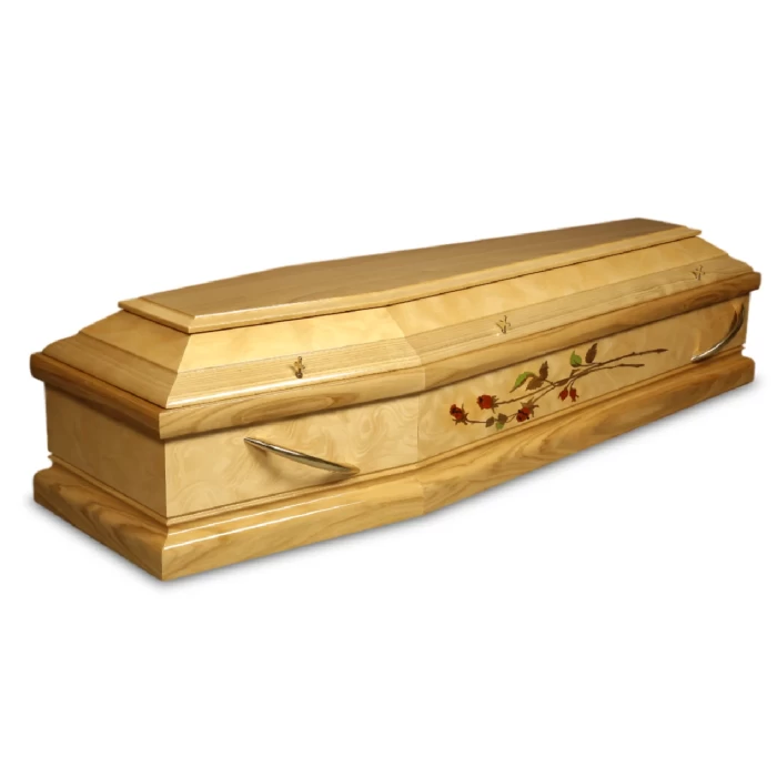 A superb coffin made from a mixture of solid oak and walnut wood burl with hand in-laid roses on the two sides. Finished elegantly with champagne premium quality interior and gold bar handles.